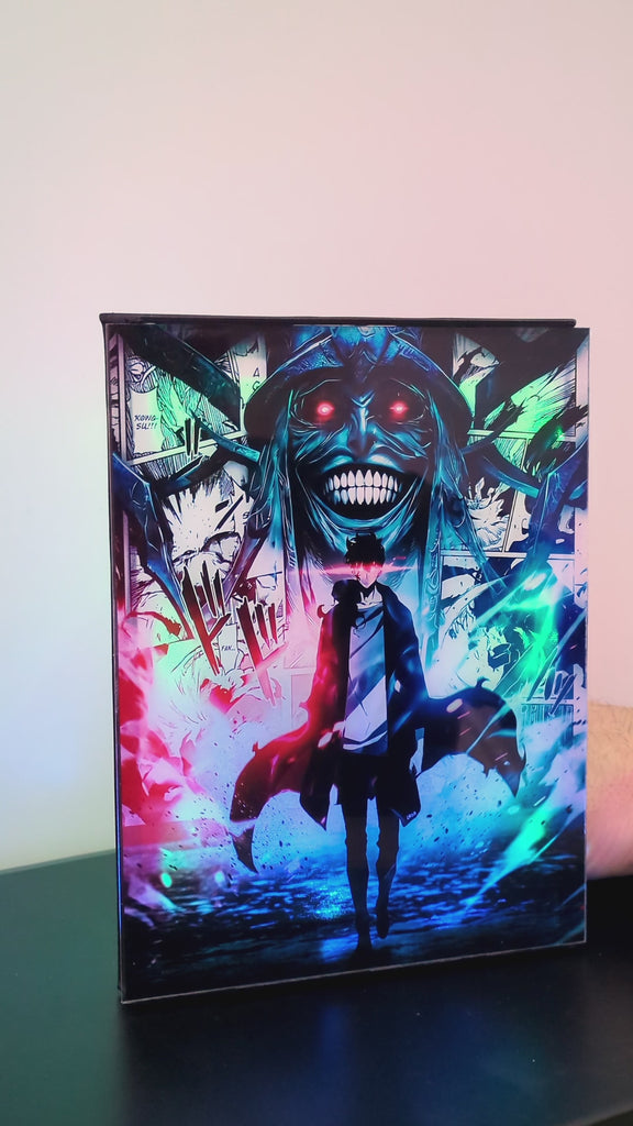 Capturez le moment de bascule où Sung Jin-woo transcende ses limites. Cette Aura Box est une mise en scène cinétique des ténèbres. Conçue pour refléter la puissance froide et l'aura mystique du Monarque des Ombres avec le juge et son regard dément en background... elle transforme votre espace en un sanctuaire de niveau S.